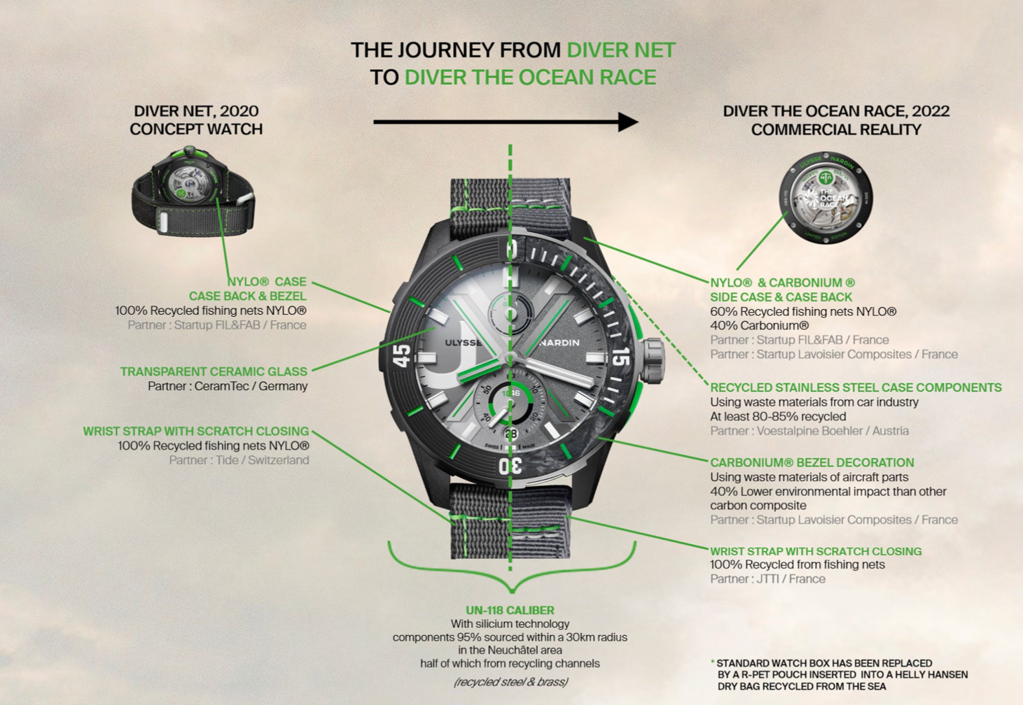 A giugno 2022, il nuovo Ulysse Nardin DIVER THE OCEAN RACE realizzato con reti da pesca riciclate sarà il primo orologio di lusso sostenibile ad ad essere immesso sul mercato e offerto in un’edizione limitata di 200 esemplari. Ciò conferma la tendenza globale del settore del lusso verso l’upcycling, già adottata dall’industria dell’alta moda. L’obbiettivo è quello di sensibilizzare creando “nuovo dal vecchio” e rigenerando materiali, in particolare la plastica. Ulysse Nardin sta attuando definitivamente il cambiamento verso l’economia circolare con questo processo di rigenerazione delle reti. Grazie al lavoro della start-up francese FIL&FAB, il brand punta così i riflettori su un materiale “meno nobile” esaltato da un approccio di “manifattura al 100%”, rendendo l’oggetto desiderabile come se fosse realizzato con un materiale più convenzionale rispetto alla poliammide.