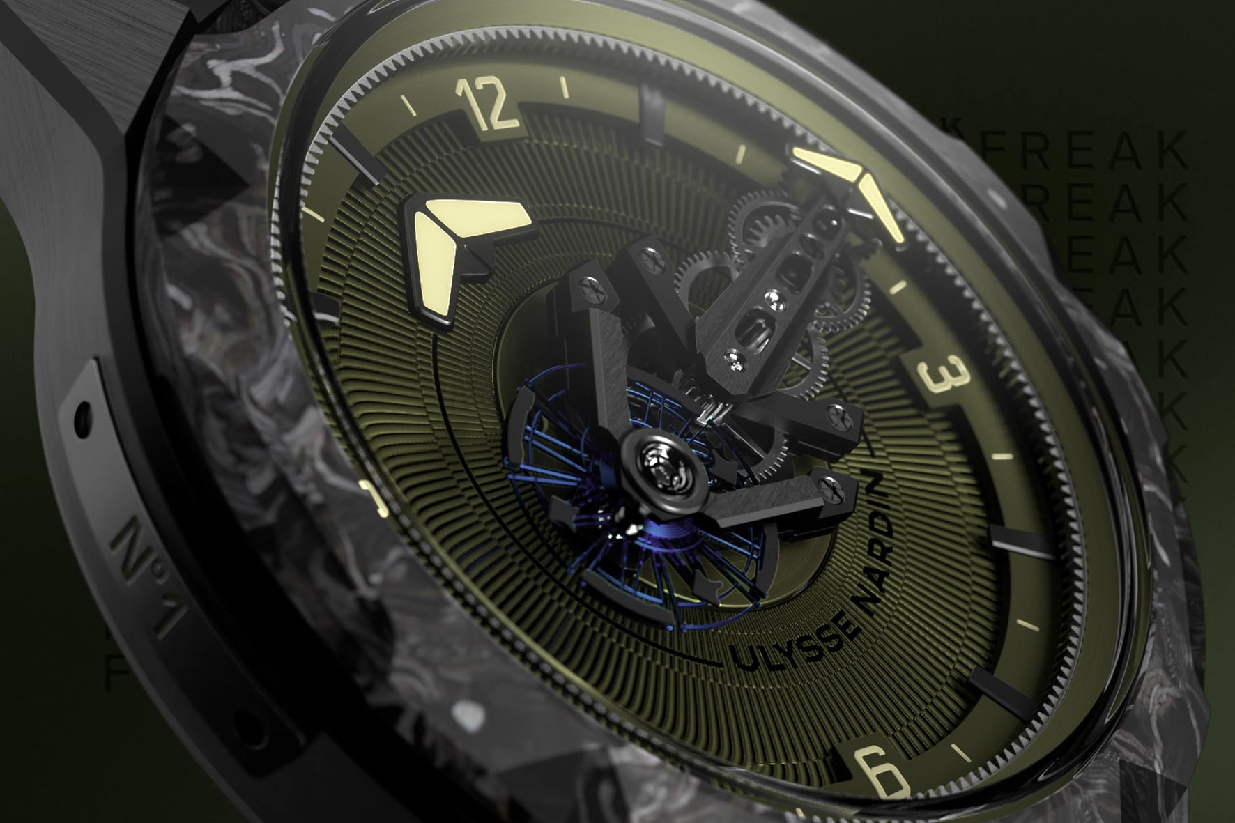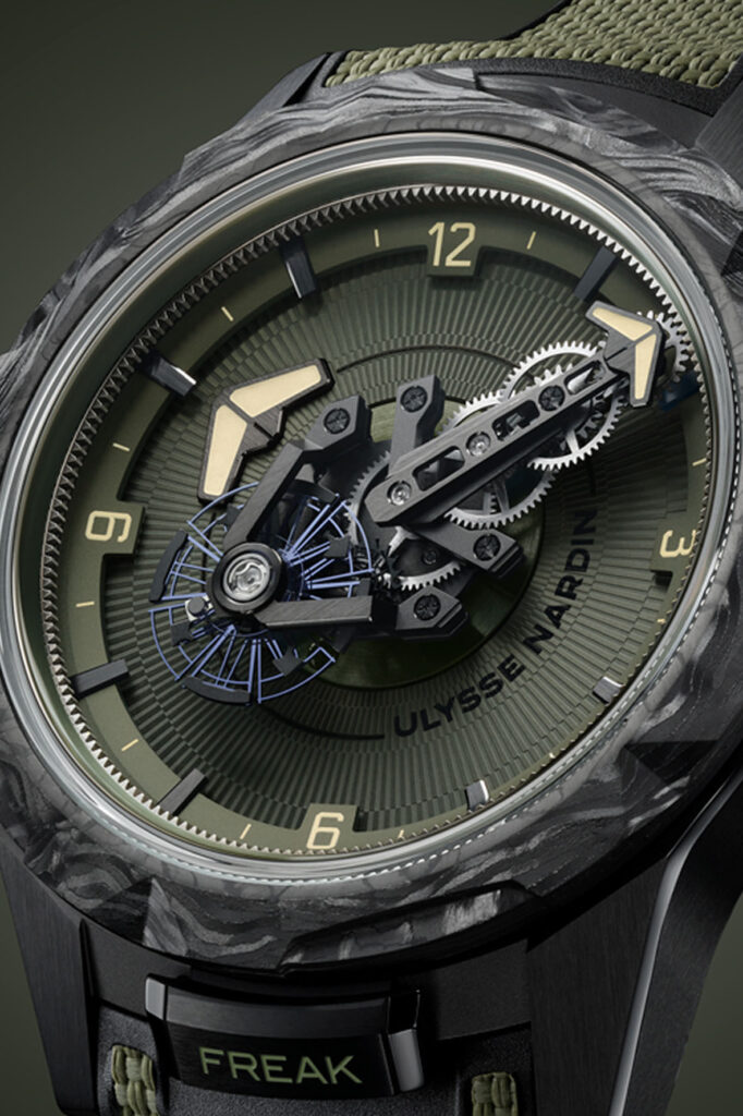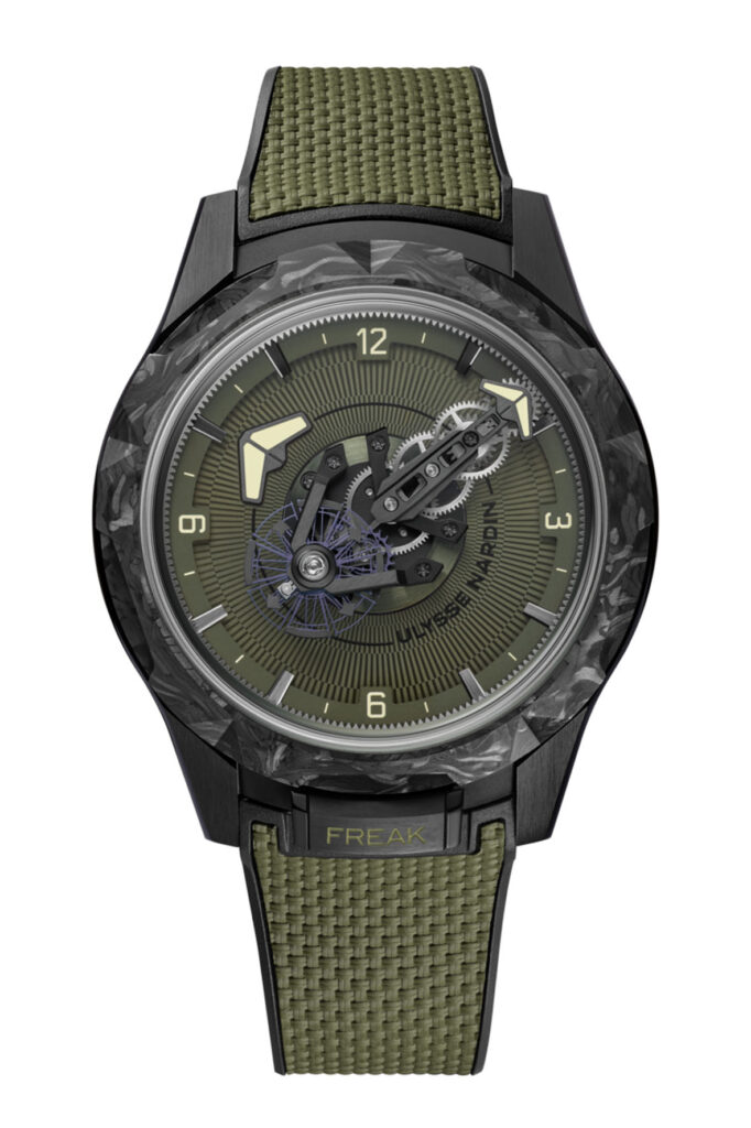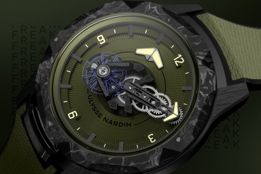20 Novembre 2023In occasione della Dubai Watch Week, Ulysse Nardin presenta Freak ONE OPS, un Freak ONE, con un tocco in più. La nuova creazione misura 44 mm di diametro e ha una cassa in titanio DLC nero, completata da una tavolozza di colore verde kaki che caratterizza lo speciale coperchio del bariletto con motivo soleil e il cinturino abbinato in caucciù integrato nell’orologio.