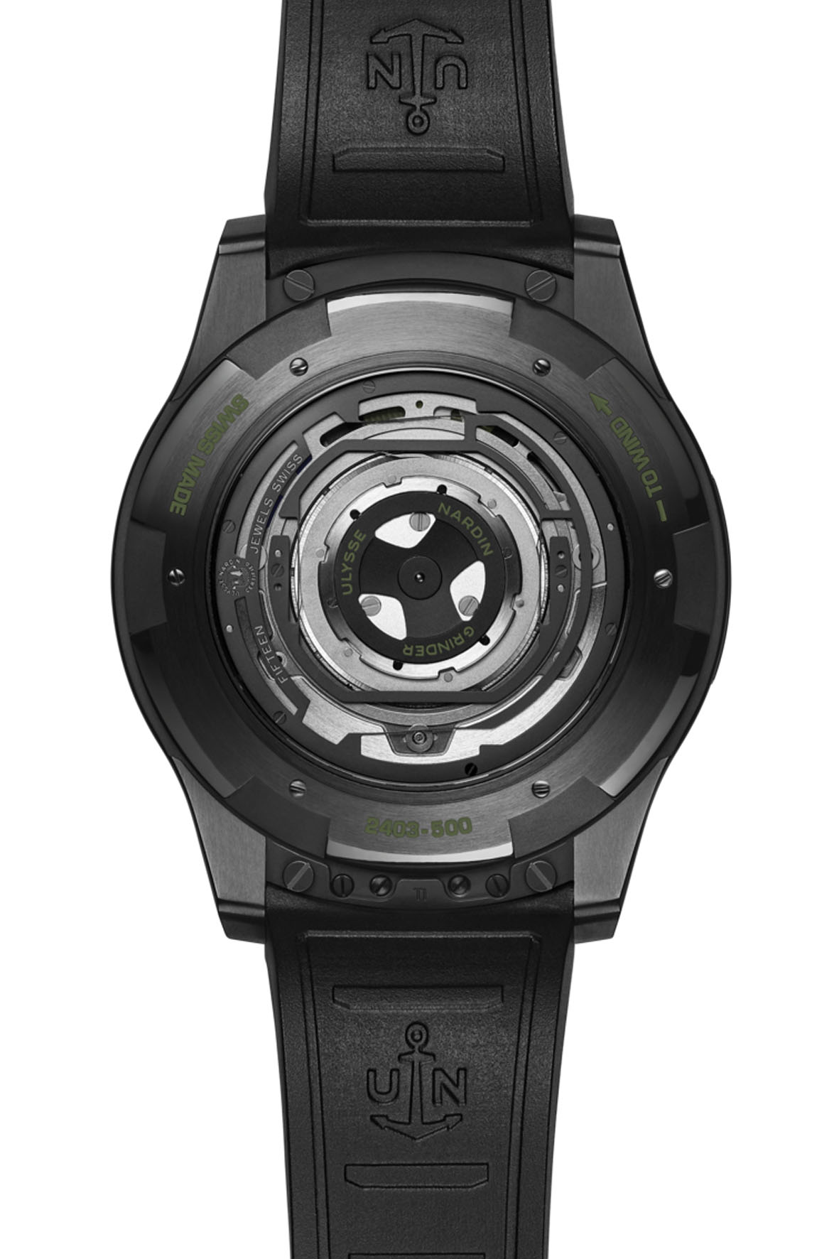 È possibile scegliere tra due cinturini integrati: uno in caucciù nero e kaki con texture balistica e uno in caucciù bicolore, anch’esso nero e kaki. Entrambi sono dotati di fibbie pieghevoli in titanio DLC nero e ceramica nera. Anche i cinturini raccontano l’impegno ambientale di Ulysse Nardin. Sono stati realizzati utilizzando il 30% di caucciù riciclato proveniente dagli scarti di produzione. (Prezzo €. 67,500)