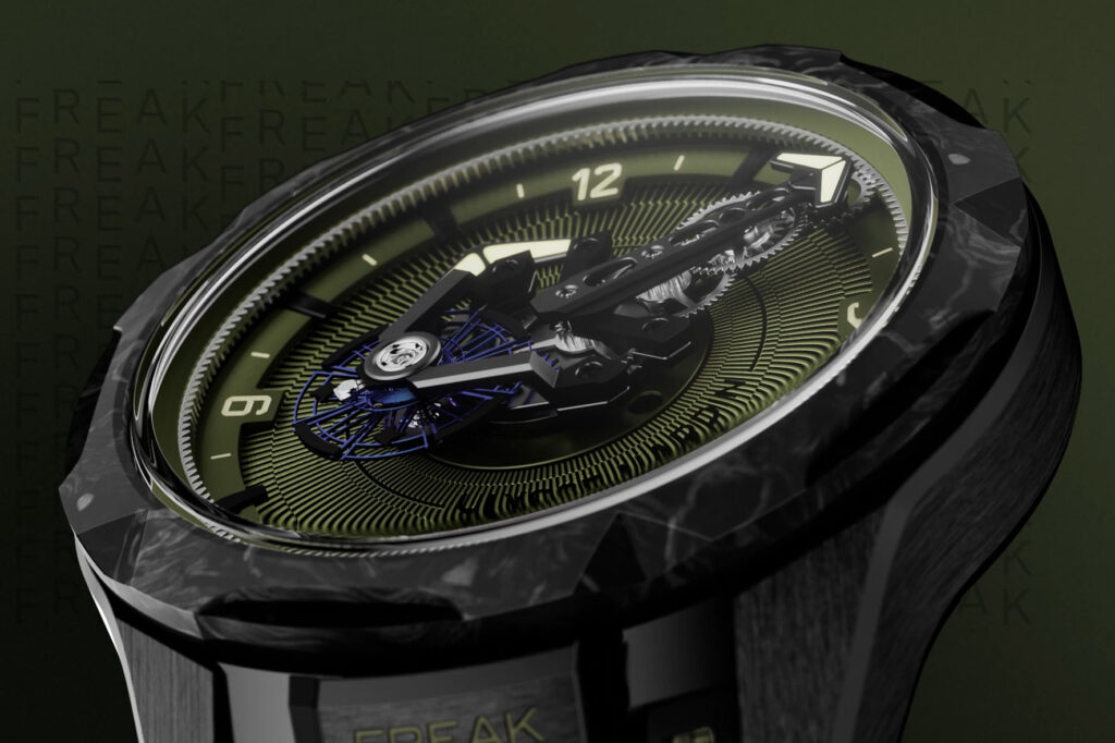 La lunetta di questo nuovo orologio è realizzata in Carbonium, un materiale innovativo con eccezionali proprietà di resistenza e leggerezza, prodotto utilizzando le stesse fibre di carbonio presenti nelle ali e nelle fusoliere degli aerei di ultima generazione. Il Carbonium proviene dall’utilizzo degli scarti del processo di fabbricazione degli aerei, riducendo così l’impatto ambientale del 40% rispetto ad altri compositi di questo materiale. La tecnica di fabbricazione è organica, il che significa che la finitura marmorizzata della lunetta del Freak ONE OPS è unica per ogni orologio.