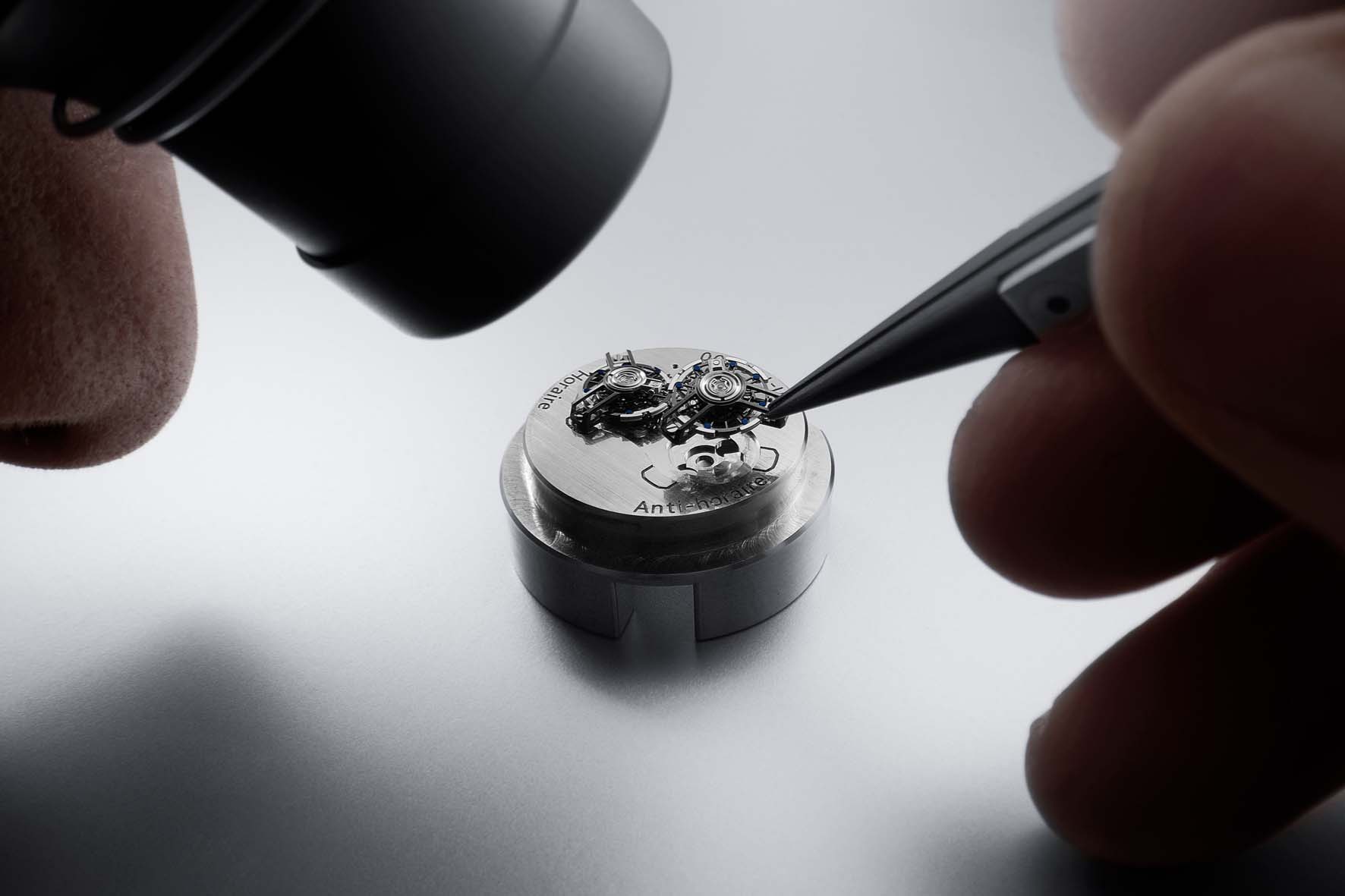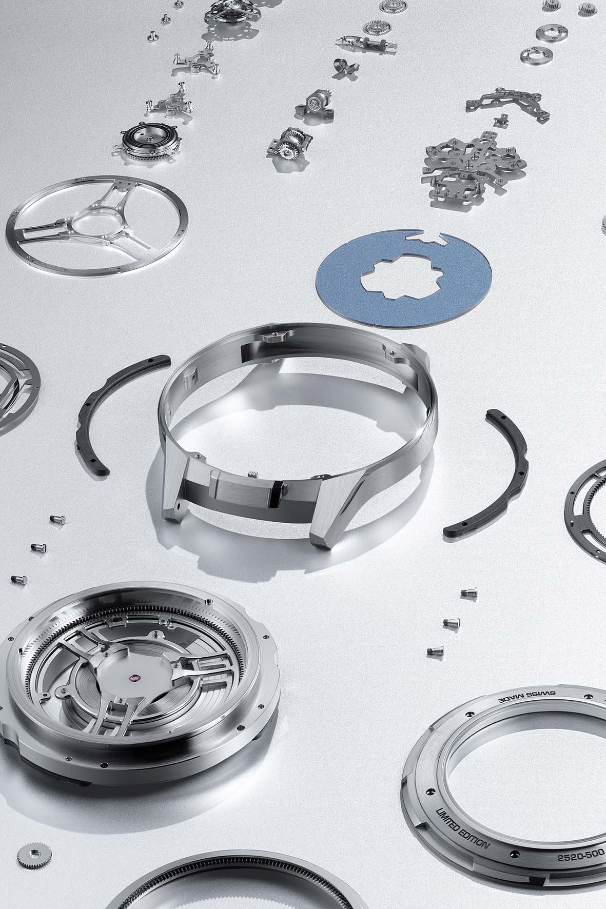 Il ponte dei minuti, composto da 327 componenti, integra due tourbillon volanti in titanio inclinati di 10 gradi, in rotazione opposta e con una rivoluzione completa ogni 60 secondi. Una costruzione di complessità impressionante che, nonostante tutto, pesa appena 3,5 grammi, risultando più leggera del 30% rispetto a quella del Freak S.
