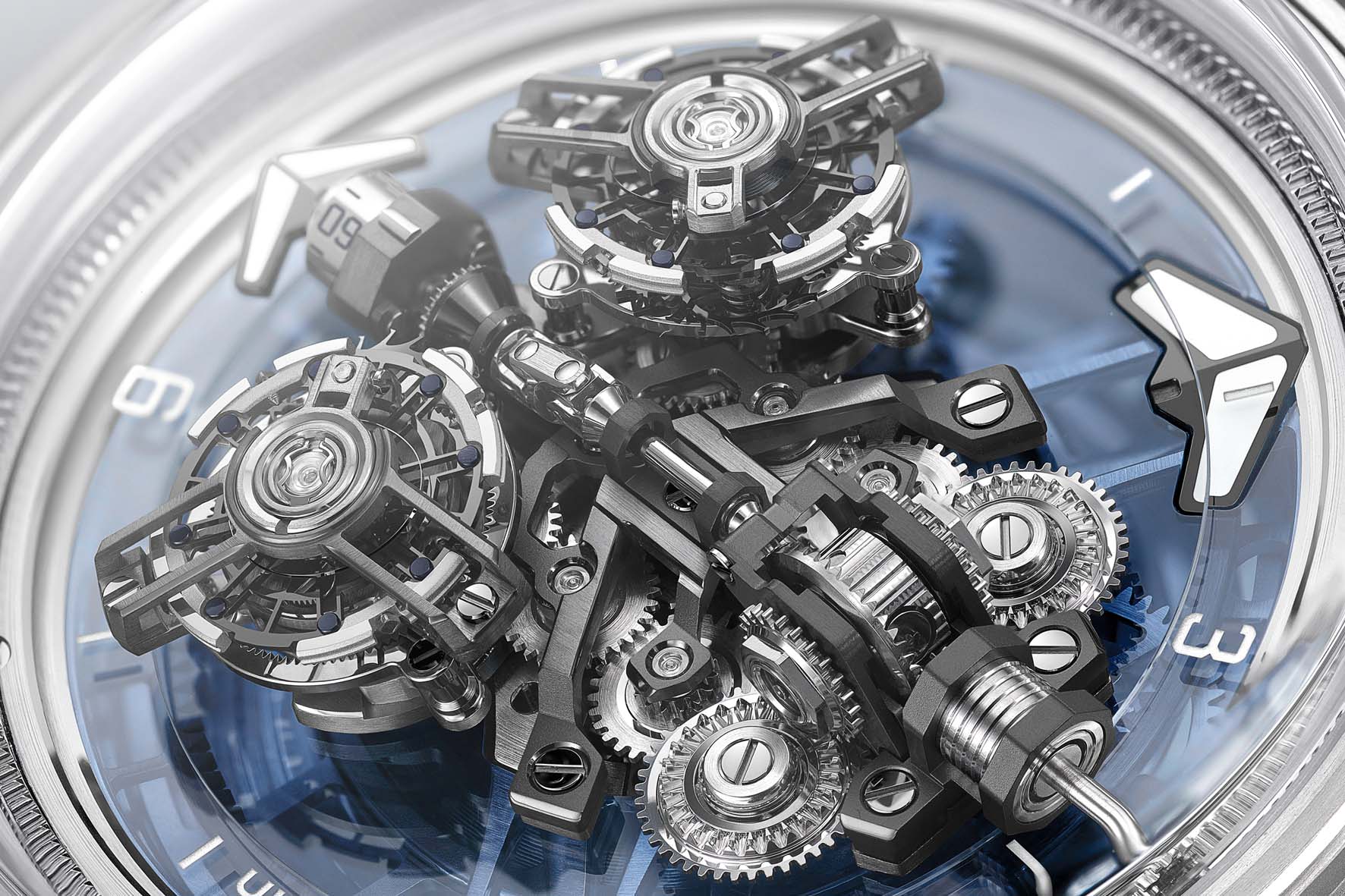 Il primo è il differenziale verticale più piccolo al mondo, appena 5 mm, composto da 69 componenti. Una micro-architettura che calcola la velocità media dei due tourbillon e ne armonizza le prestazioni, garantendo precisione e stabilità.