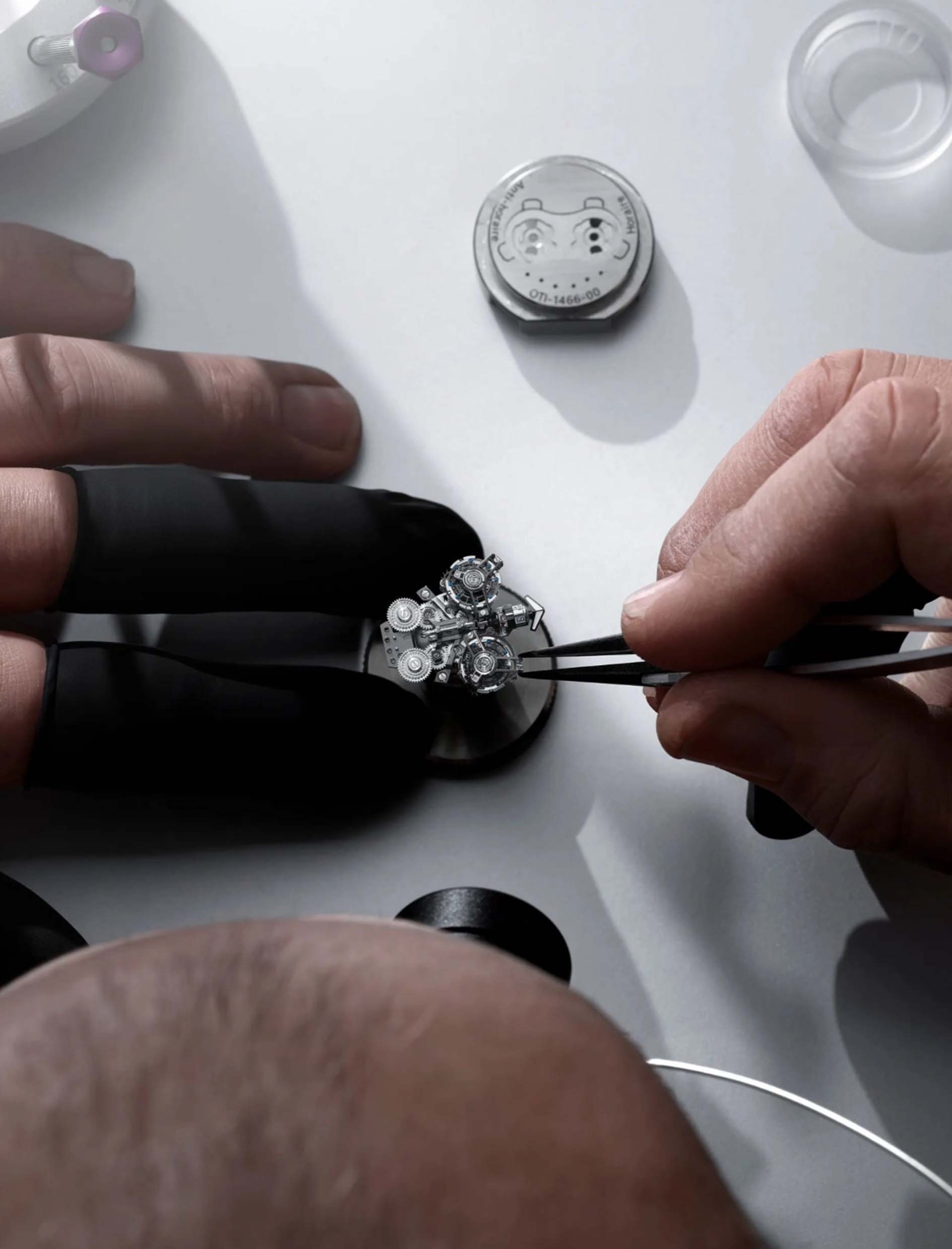 Eppure, per quanto futuristico, il [SUPER] FREAK resta profondamente umano. Oltre il 70% dei componenti è rifinito a mano. Ogni esemplare richiede 60 ore di assemblaggio, affidato integralmente a un unico maestro orologiaio dell’Atelier de Haute Horlogerie di Ulysse Nardin. Ponti in titanio decorati manualmente, graniture, sabbiature, lucidature eseguite con strumenti tradizionali: qui l’alta tecnologia non sostituisce il savoir-faire, lo amplifica.