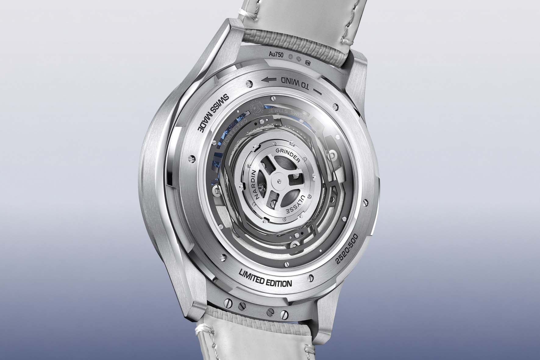Alimentare una simile architettura richiede energia fuori scala. Ed è qui che entra in gioco Grinder, il sistema di carica automatica brevettato da Ulysse Nardin, riconosciuto come il più efficiente mai sviluppato. Grazie a una costruzione con quattro leve ultrasottili da 0,12 mm, il sistema converte anche il minimo movimento del polso in energia, assicurando una riserva di carica di tre giorni.