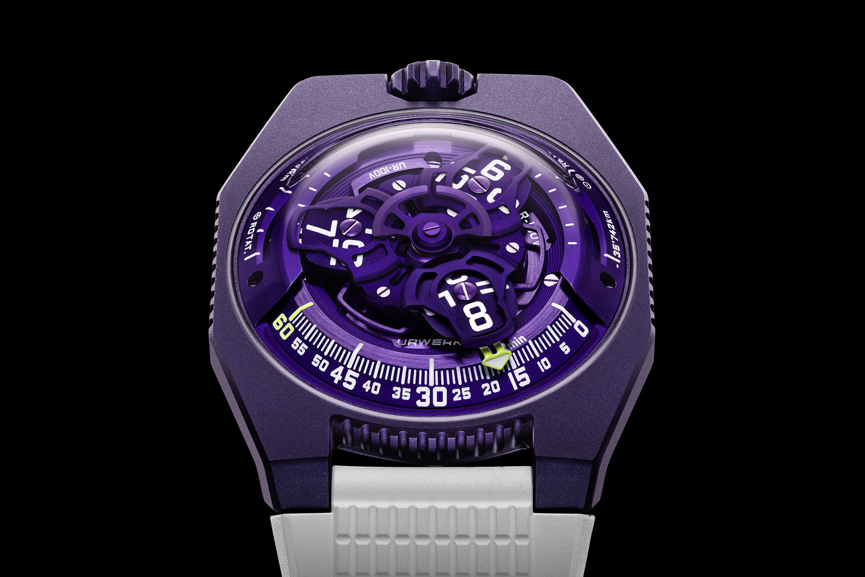 4 Settembre 2022Se dopo il modello con bracciale in titanio e il Time and Culture pensavamo che la collezione UR-100 fosse ormai al completo ci sbagliavamo… Ai Geneva Watch Days 2022 Urwerk ha infatti svelato il nuovo UR-100V UltraViolet, una nuova versione con cassa in DLC Viola e cinturino in gomma bianco a dir poco spaziale.