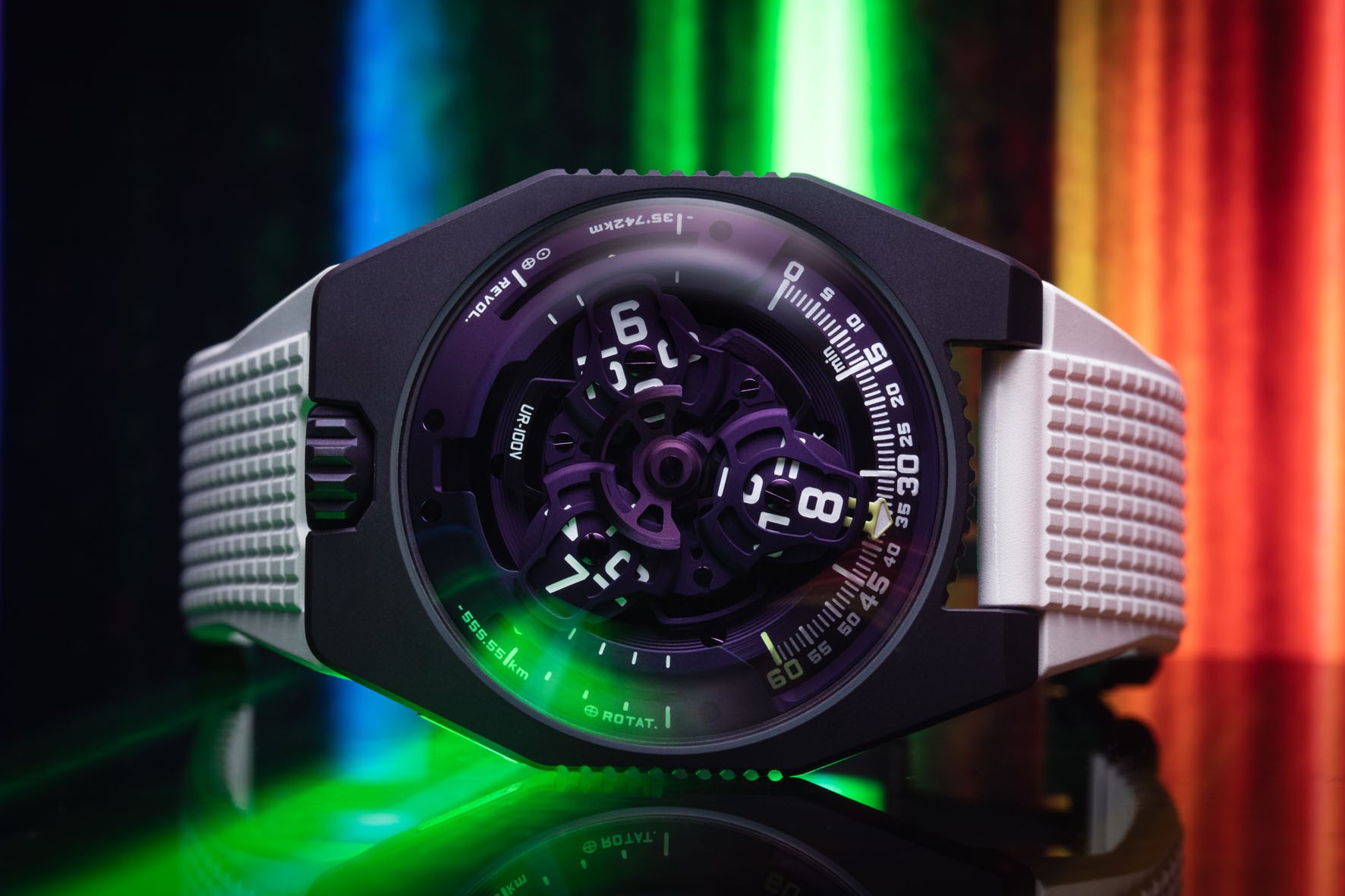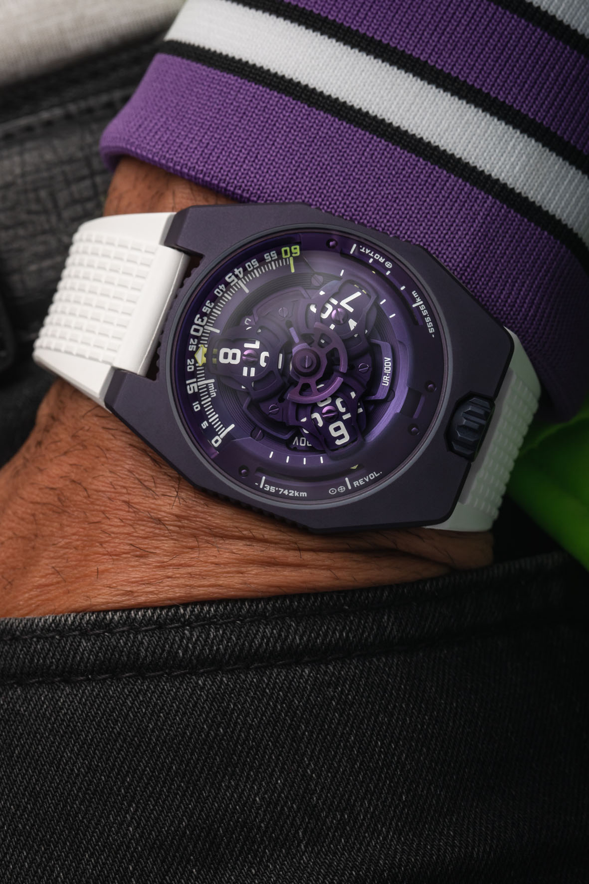 Dotato di un cinturino in gomma, l’UR-100V UltraViolet riprende i codici della famiglia 100. Sull’UR-100V, la visualizzazione delle ore e dei minuti del satellite è completata da nuove informazioni. Una volta raggiunto il 60° minuto, la lancetta dei minuti svanisce e riappare come un contachilometri. Illustra i 555 chilometri percorsi ogni 20 minuti da ogni abitante del Pianeta Terra. Questa è infatti la velocità media di rotazione della Terra calcolata all’Equatore (distanza di rotazione). Appare esattamente opposto è la rivoluzione terrestre attorno al sole (distanza orbitale), ovvero 35.740 chilometri ogni 20 minuti. Sul volto dell’UR-100V, ore e chilometri condividono quindi lo stesso stato, la stessa scala di valori. Queste unità sono illuminate di notte in blu per le ore e in verde per i chilometri.