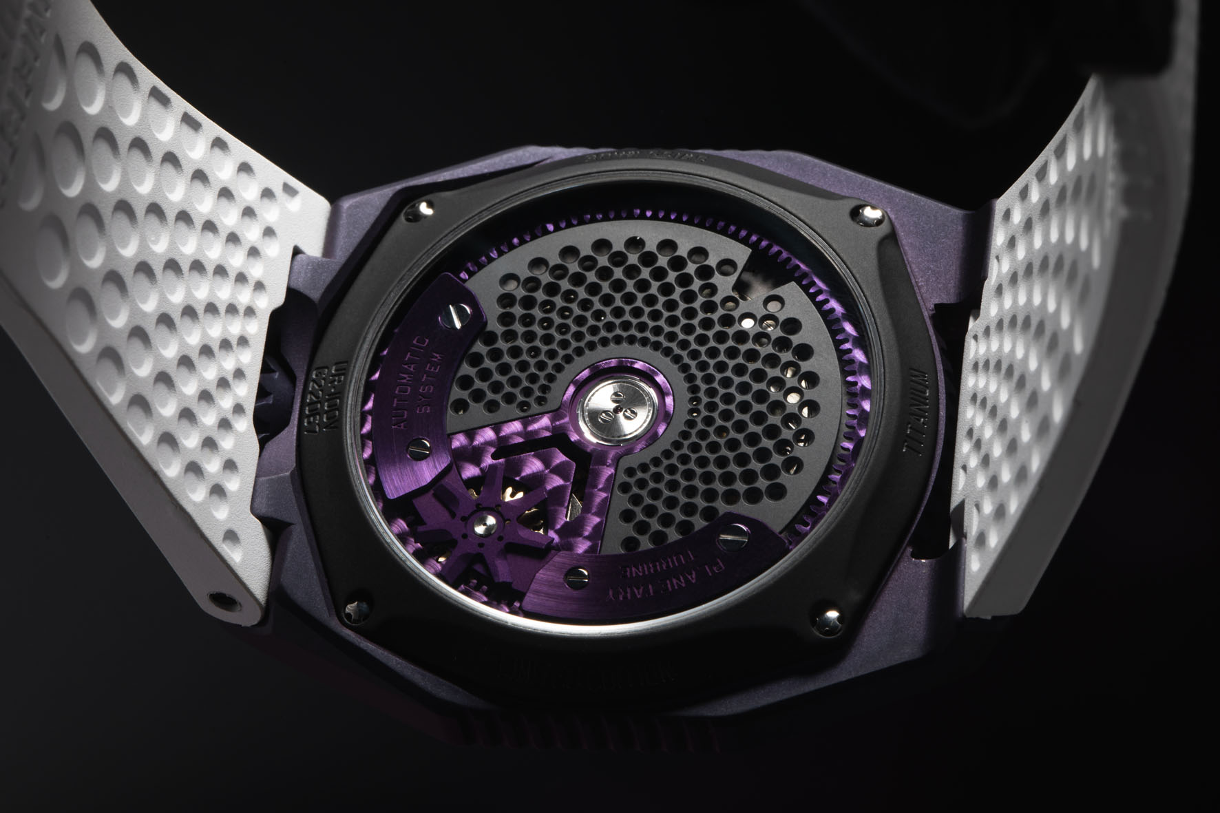 Martin Frei parla del colore che è così speciale per lui: “Mi piace il fatto che un colore sia molto più di ciò che possiamo percepire. Lo spettro cromatico visibile ai nostri occhi varia dal rosso al viola. Al di là di quella sfumatura, il colore si trasforma in una forma d’onda che i nostri occhi non riescono più a rilevare, l’ultravioletto. Sono affascinato dall’idea di creare un orologio che celebri questo confine, questo punto di non ritorno, questo passaggio da percepibile a impercettibile. L’UR-100V UltraViolet parla di questa esplorazione dei limiti Il nostro UltraViolet trasmette qualcosa di mistico, è una tonalità che si trova al confine di una dimensione che chiamiamo colore.”