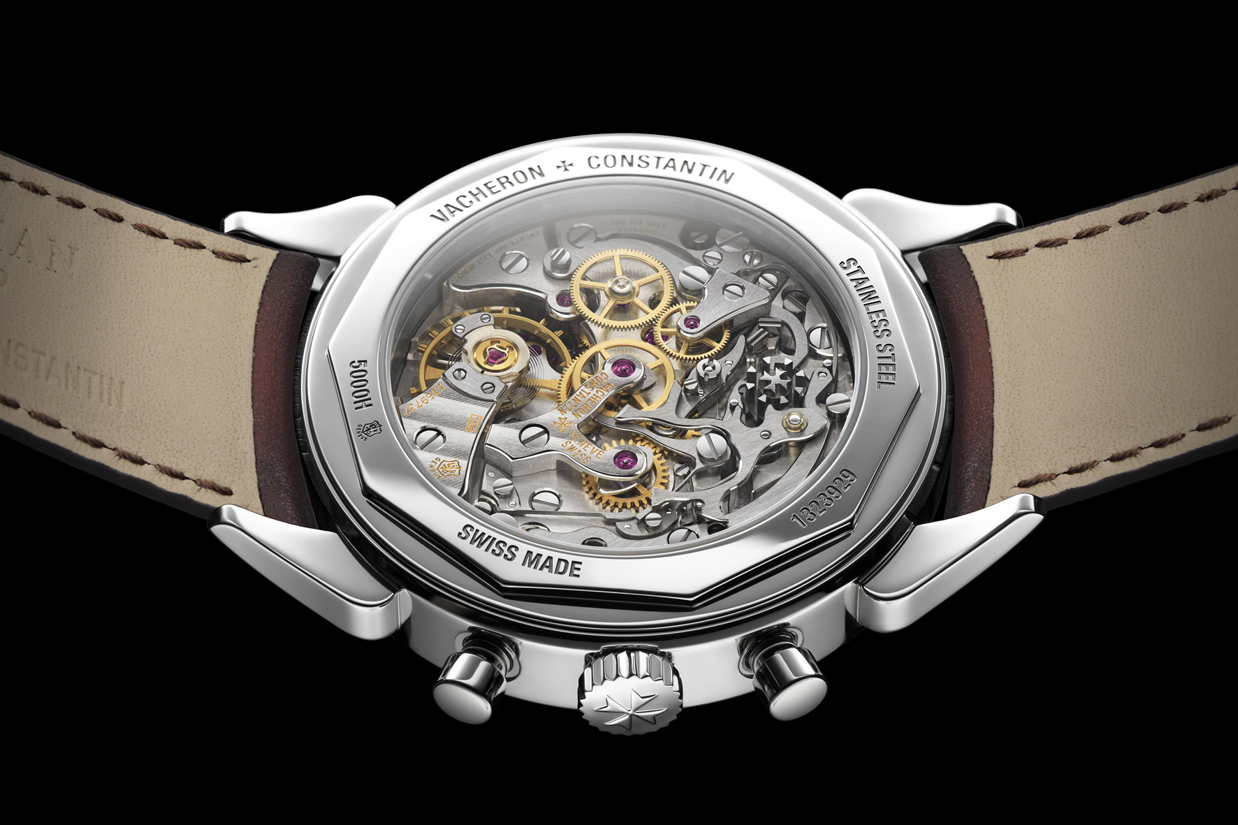 Oggi, all’interno della collezione Historiques, Vacheron Constantin presenta una versione in acciaio del modello “Cornes de vache Ref.6087”, il primo cronografo a tenuta stagna della Maison lanciato nel 1955. Immediatamente riconoscibile per le sue caratteristiche anse a forma di corna, questo modello è oggi uno dei più ricercati dai collezionisti. Questa riedizione, esteticamente fedele all’originale, rispetta gli standard dell’orologeria contemporanea. Il diametro della cassa impermeabile a 30 metri è così stato portato da 35 mm a 38,5 mm. Oggi accoglie il calibro cronografo 1142 a carica manuale, con riserva di carica di 48 ore. Il meccanismo di misura dei tempi brevi è comandato da una ruota a colonne, secondo la grande tradizione orologiera, decorata con una testa di vite la cui forma s’ispira alla croce di Malta, emblema di Vacheron Constantin. Questo movimento interamente smussato e decorato a mano, con finiture perlate lato quadrante e Côtes de Genève sul retro, può essere ammirato attraverso il fondello trasparente in vetro zaffiro incorniciato da una lunetta a dieci lati.