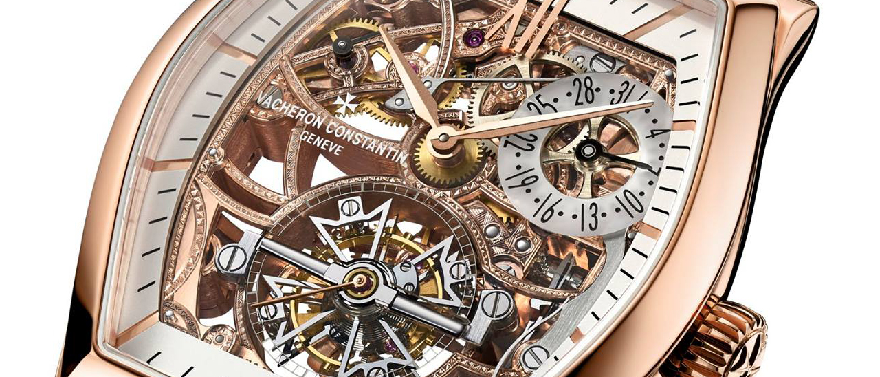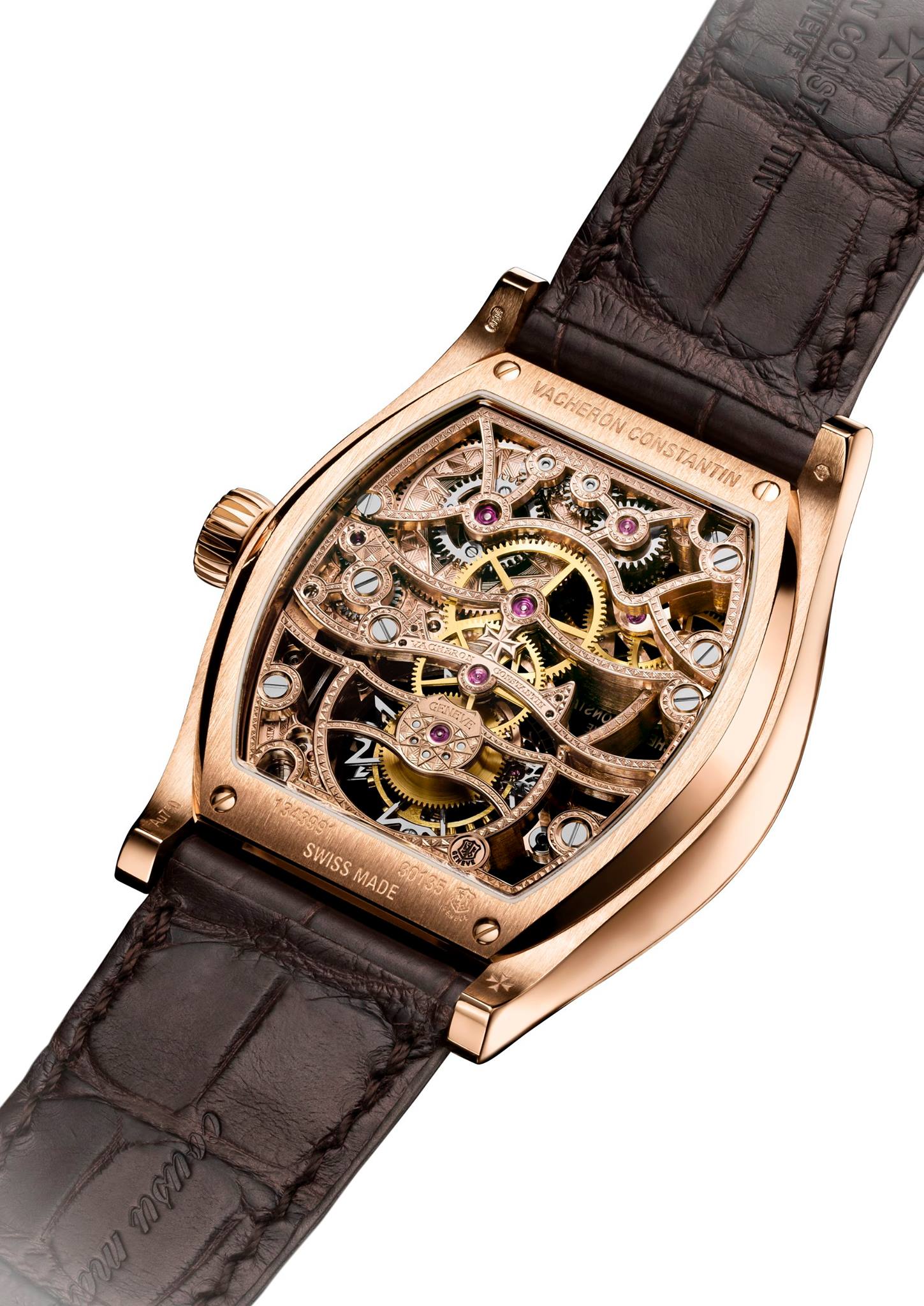 Questa nuova creazione che reca il Punzone di Ginevra è una rarità nell’universo dell’Alta Orologeria. La sua cassa sagomata in oro rosa di 38 x 48,24 mm, incornicia un movimento tourbillon di forma tonneau interamente scheletrato e inciso a mano. Un gioco di luci e ombre, permette al calibro 2790 SQ di Vacheron Constantin di svelare un’originale decorazione architettonica che gioca con le forme geometriche. L’ispirazione stilistica alla base delle opere di questi professionisti è caratterizzata da delicati giochi di luce ottenuti da una piramide di chiaroscuri, frutto dell’utilizzo ripetuto delle forme geometriche fondamentali. Il risultato è un mosaico tridimensionale, interamente cesellato a mano e straordinariamente valorizzato da un tourbillon a forma di Croce di Malta. Sono necessarie circa 540 ore di lavoro, rigoroso e accurato, dallo sviluppo del calibro alla finitura manuale di ognuno dei suoi 246 componenti, per ottenere il sofisticato equilibrio fra il meccanismo del tourbillon e la leggera estetica scheletrata. Rivestito in oro rosa, lo straordinario meccanismo che muove le ore, i minuti, i secondi, il datario e la riserva di carica è visibile attraverso un quadrante di vetro zaffiro trasparente incorniciato da un anello argentato e punteggiato da 11 indici a bastone, nonché da un numero romano (XII) in oro rosa.