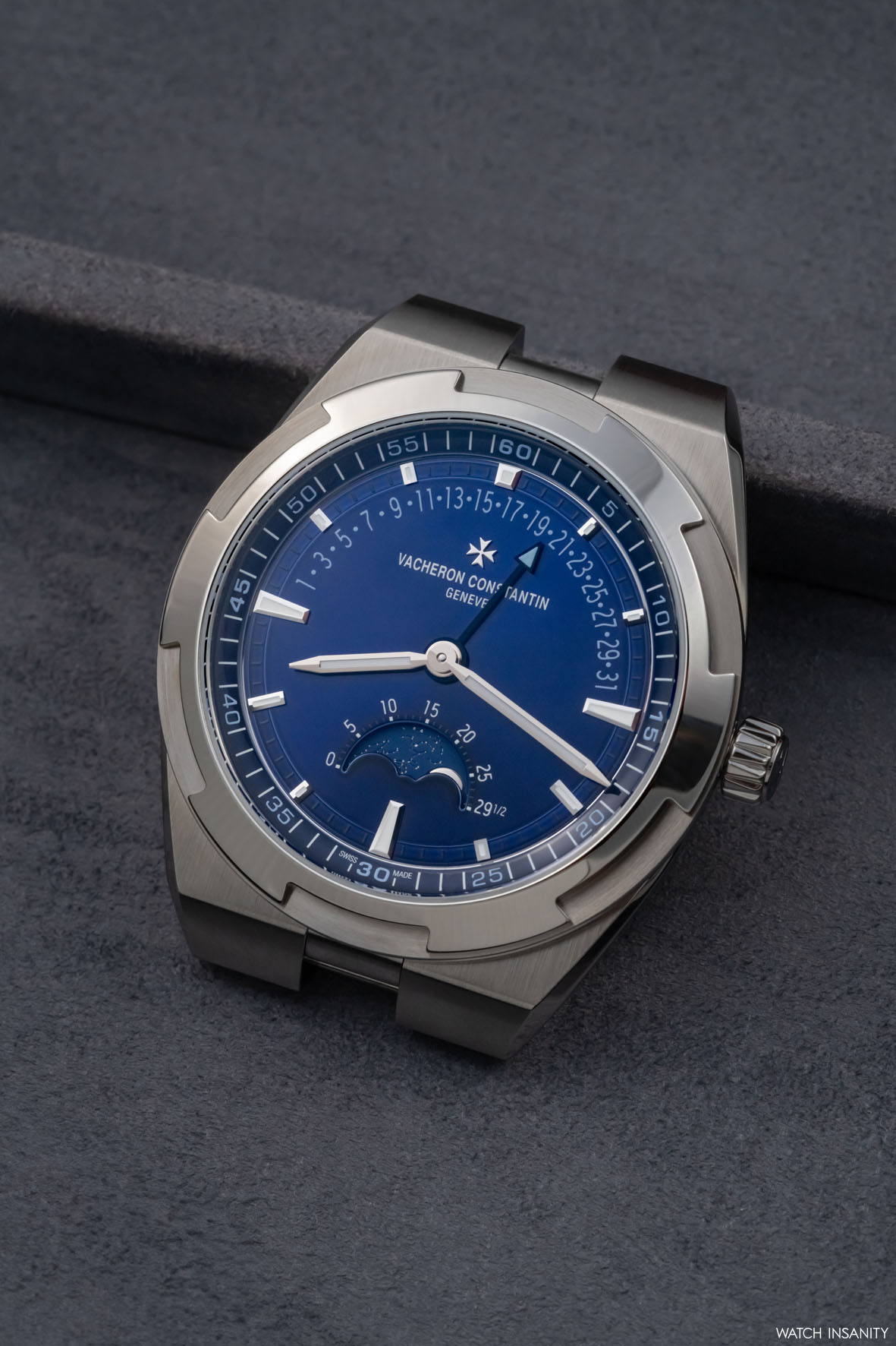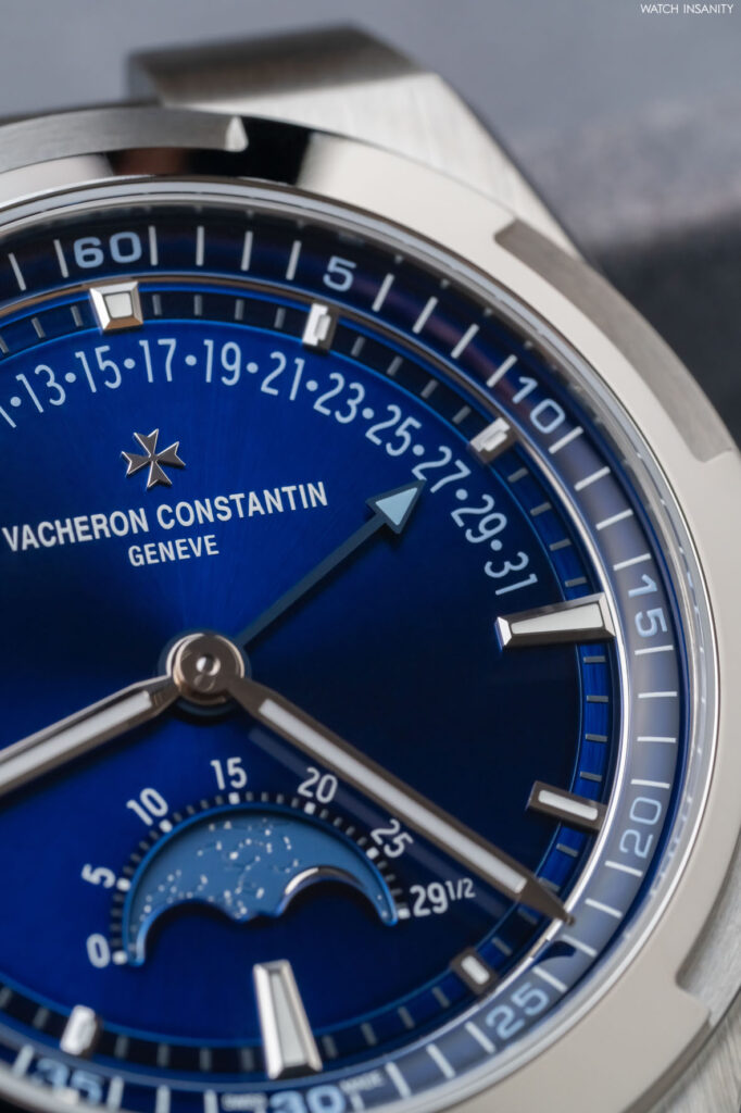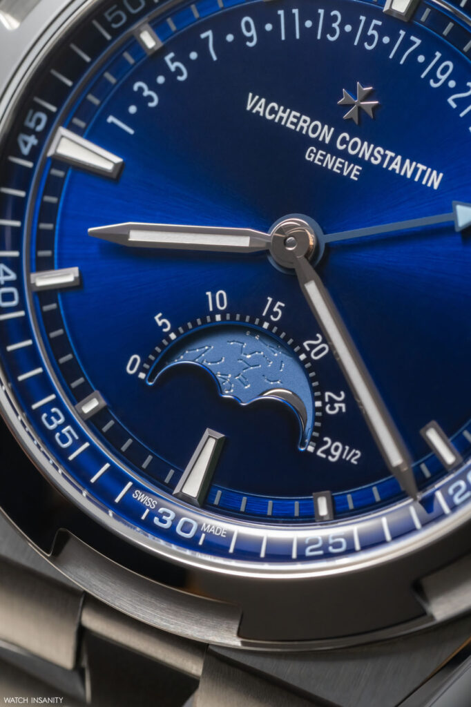 Lo dice in primis il quadrante. Il suo blu traslucido laccato, tipico della collezione Overseas, è il primo elemento che colpisce e che affascina. Ha il pregio, tra le altre cose, di far spiccare ancora di più la leggibilità delle informazioni, che Vacheron Constantin ha reso fruibili al massimo collocandole agli estremi opposti del quadrante. La data retrograda è posta su un arco che va dalle ore 9 alle ore 3; la finestra delle fasi lunari è posizionata al di sopra dell’indice delle 6.