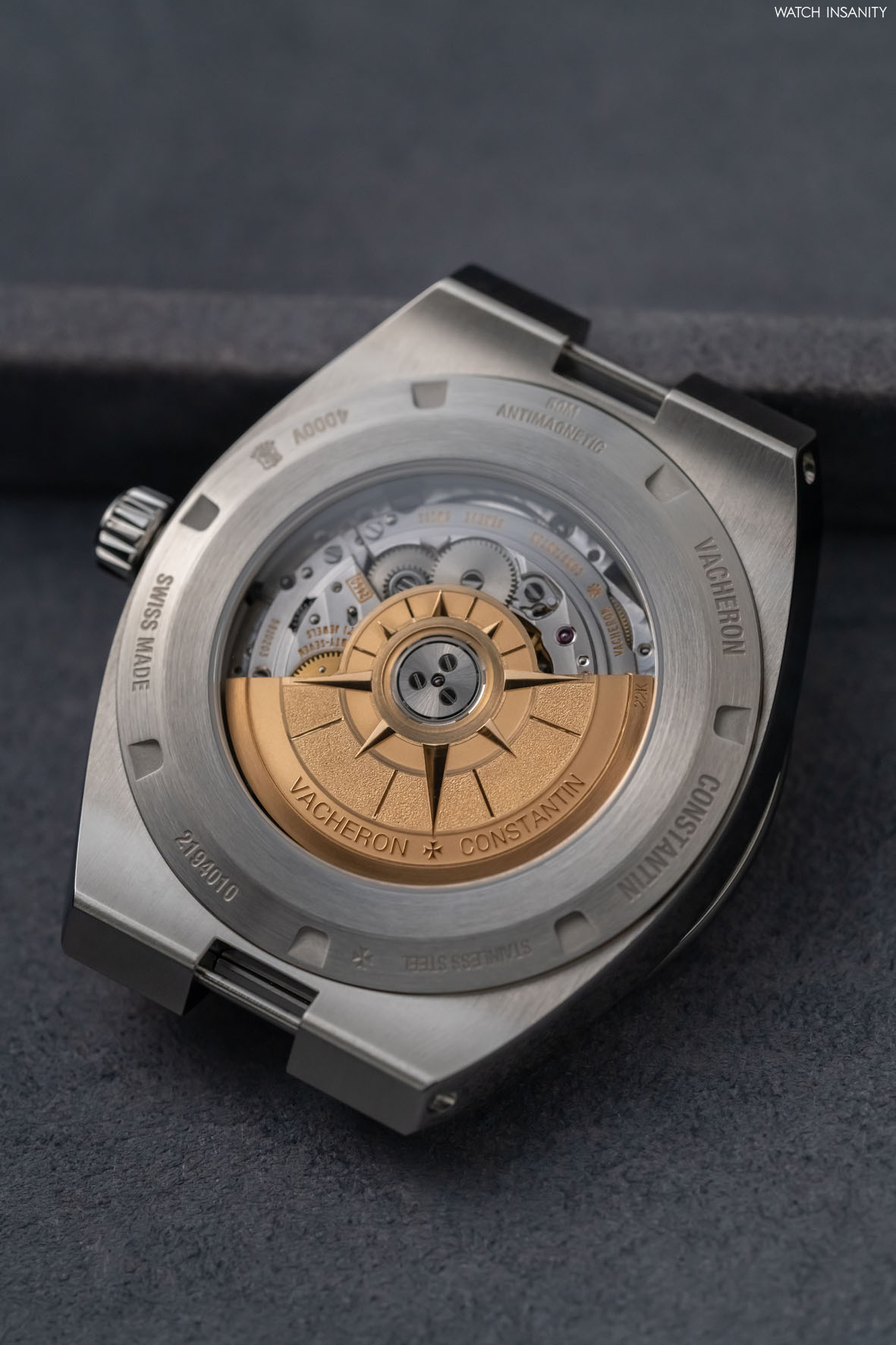 Un vetro zaffiro trasparente sul fondello rivela il movimento 2460 R31L/2 e la massa oscillante in oro 22 carati, ornata dal caratteristico motivo della rosa dei venti, tipico di questa collezione di Vacheron Constantin. Purtroppo i ponti e la platina nascondono il complesso sistema di leve che governa la data retrograda; trattandosi però della linea Overseas, quindi di con un dna sportivo più che elegante, è forse meglio così: si perde un po’ in fascino, ma ne guadagna l’impressione generale di robustezza e affidabilità che dà l’orologio.