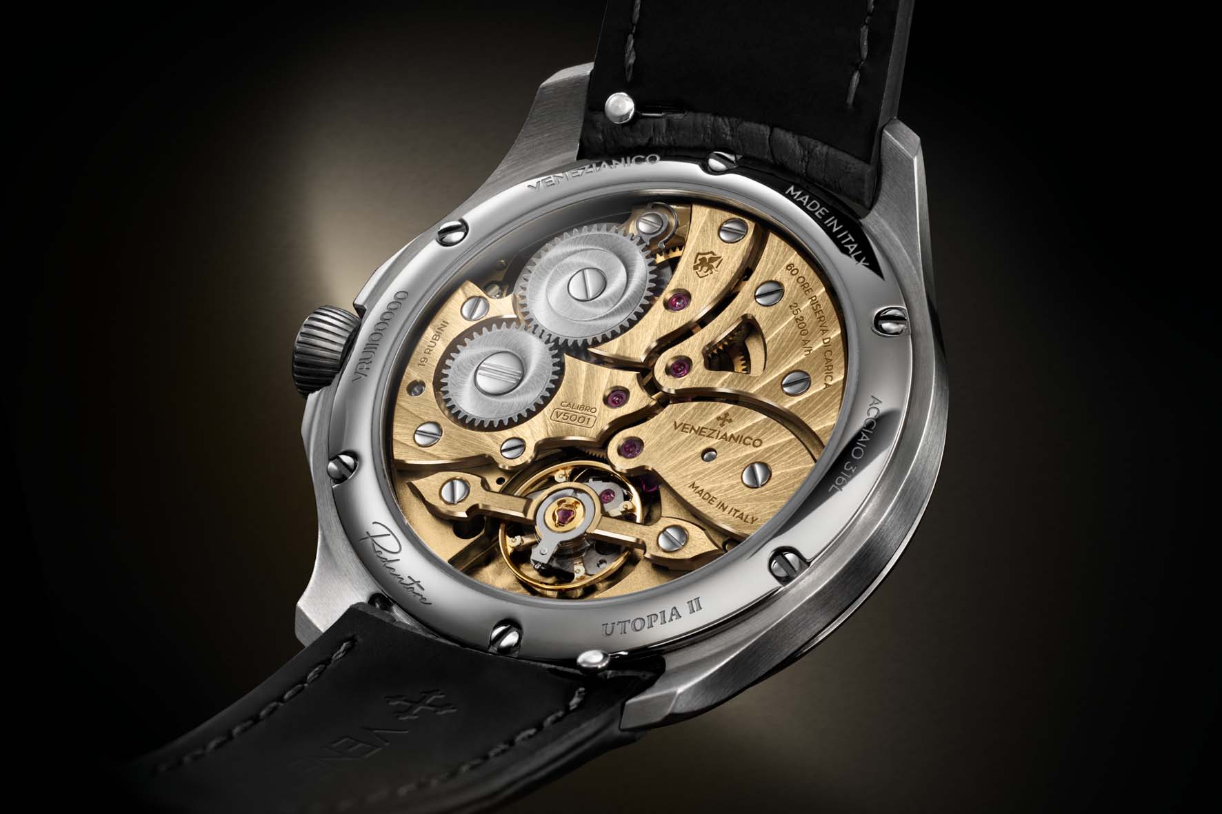 Proprio dal cuore, dal movimento, vale la pena iniziare per raccontare Redentore Utopia II. Ossia dal calibro V5001, evoluzione del V5000 montato su Redentore Utopia I. Sia il V5000 sia il V5001 sono prodotti da OISA, progettati da Fausto Berizzi e Andrea Menegazzo e assemblati nell’Atelier di Venezianico da Daniele Zorzetto, maestro orologiaio con una lunga esperienza nella regolazione di bilancieri a inerzia variabile con masselottes e spirale libera.