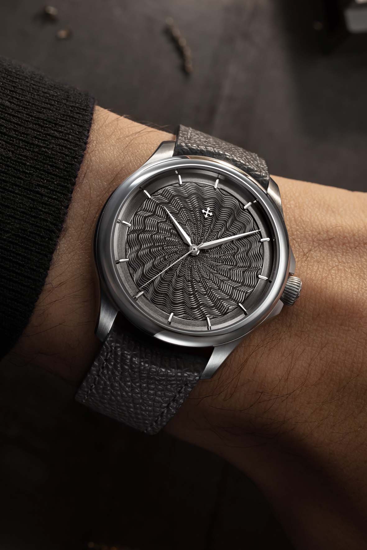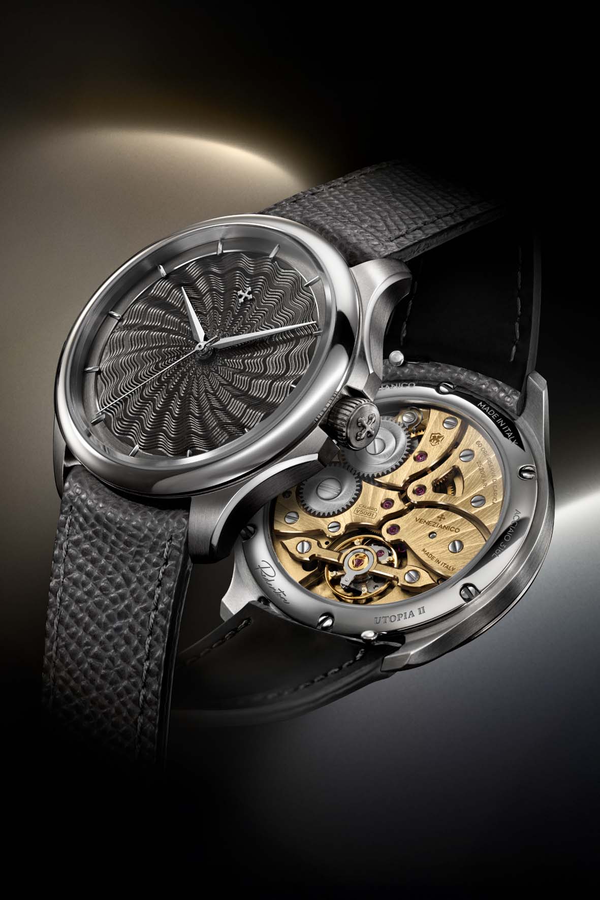 Il quadrante di Redentore Utopia II è il cuore visivo dell’orologio. «Con un quadrante tradizionale non avrei dubbi nel dire che l’orologio è più affascinante visto dal fondello. In questo caso, però, non mi sento di attribuire una predominanza al calibro: la bellezza è perfettamente bilanciata. Davanti e dietro si equivalgono, cinquanta e cinquanta», ci dice Morelli. Il motivo decorativo è stato chiamato Marea, perché le sue onde ricordano il movimento delle onde nella laguna di Venezia. È stato sviluppato per questo modello in collaborazione con l’Atelier Renzetti di Milano, uno dei pochissimi laboratori al mondo ancora dediti all’arte del guilloché tradizionale.