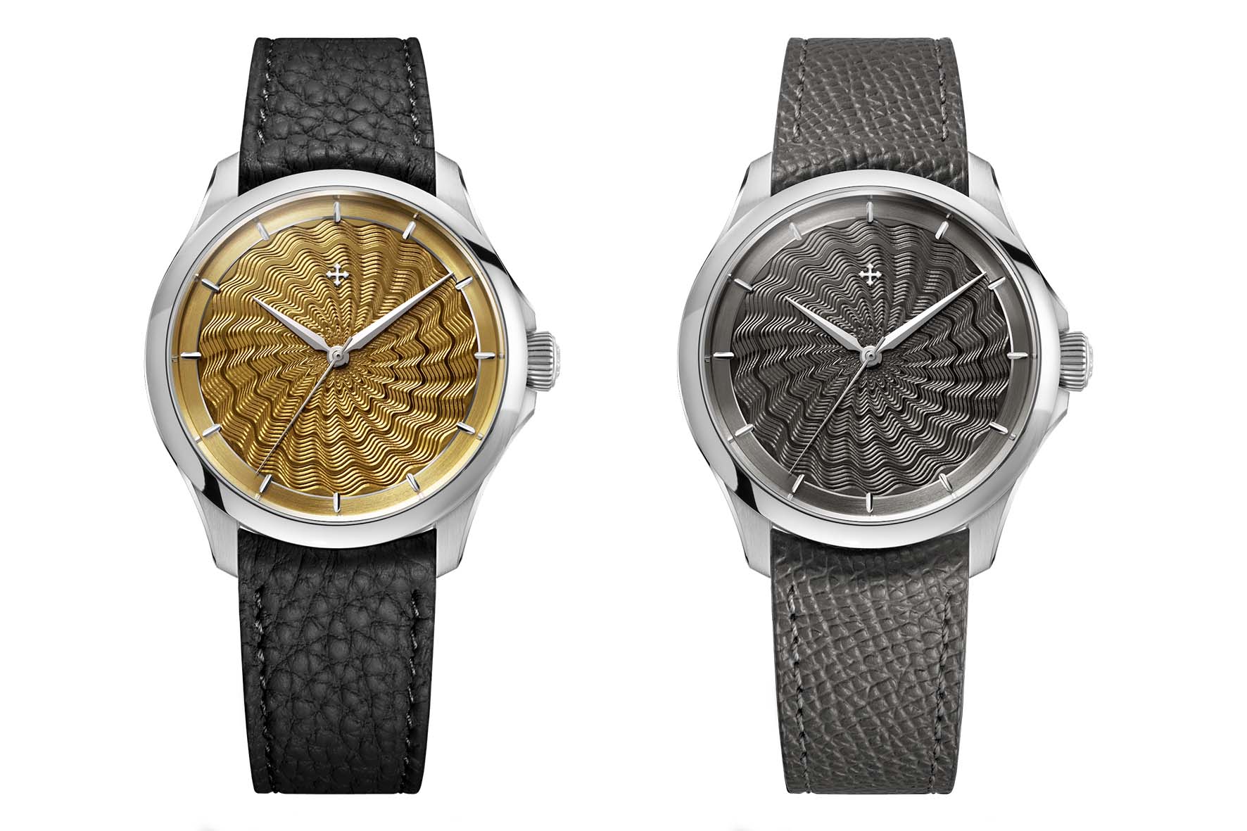 L’evoluzione del calibro non è solo meccanica ma anche estetica. Entrambi hanno uno spessore ridotto di 3,5 mm, una frequenza di 25.200 alternanze/ora, una riserva di carica di 60 ore e una precisione regolata a ±3 secondi al giorno, come ha ricordato Morelli. L’estetica del V5001 è però stata raffinata: finitura a doppia chiocciola delle ruote, ponti e platina trattati con rivestimento galvanico in oro 24 carati, perlage e Côtes de Genève che si irradiano verso la periferia del calibro partendo dal bilanciere a ore 6, che ne diventa così il centro visivo. Inoltre, il ponte del bilanciere a doppio ancoraggio ha una finitura étirage e il bilanciere a inerzia variabile in lega di rame-berillio è protetto dal sistema antiurto KIF Elastor, sviluppato appositamente per questo movimento. Grazie a una molla elicoidale a forma di stella, posta attorno alla pietra d’incassaggio, il sistema assorbe l’energia generata dagli urti e riporta il bilanciere nella posizione ottimale.