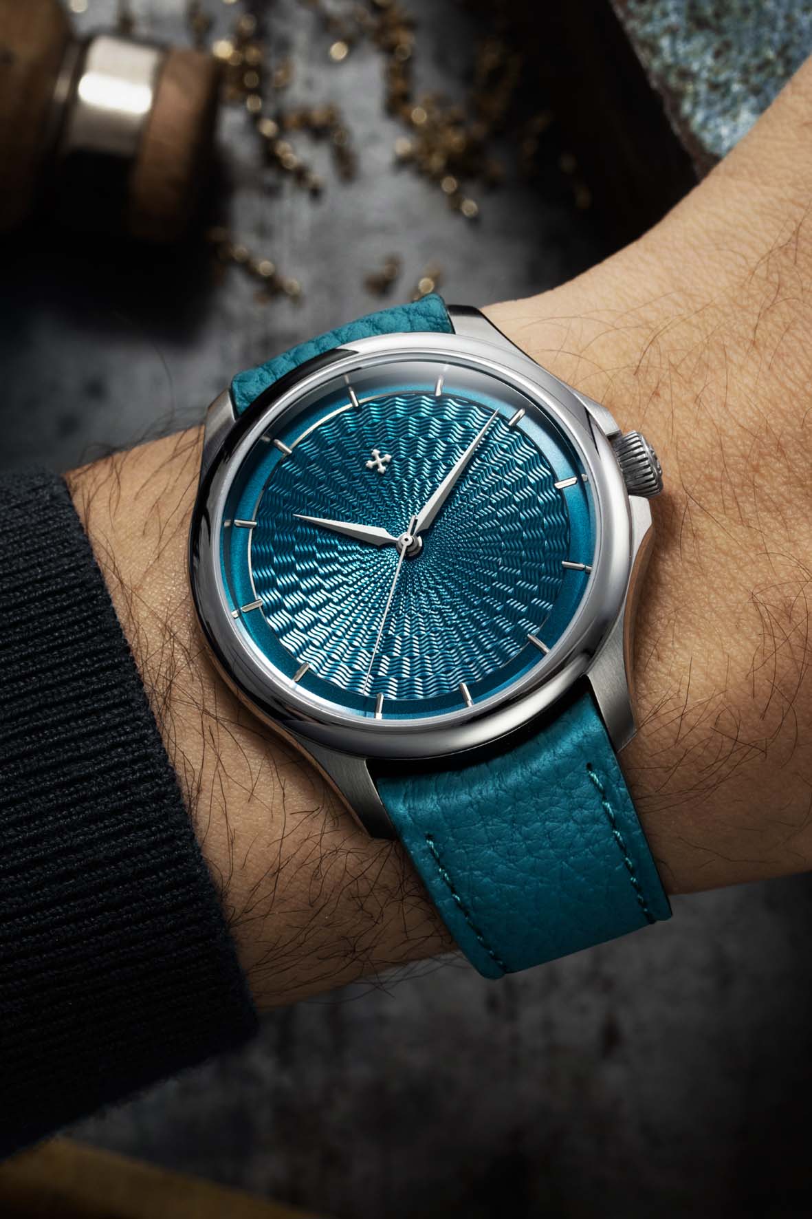 Sotto il vetro zaffiro antiriflesso, il quadrante è disponibile in due versioni, Alpha e Beta. La prima ha una finitura galvanica color oro, che ricorda i riflessi dei mosaici della basilica di San Marco ed evoca il patrimonio decorativo e la tradizione artistica di Venezia. È abbinata a un cinturino in pelle di vitello nera lavorata a mano. La finitura galvanica di Beta è in grafite, tonalità che richiama i materiali strutturali e costruttivi della città lagunare, il colore del ferro battuto, delle ringhiere, dei pali di ormeggio. Beta è completato da un cinturino in pelle saffiano rifinito a mano.