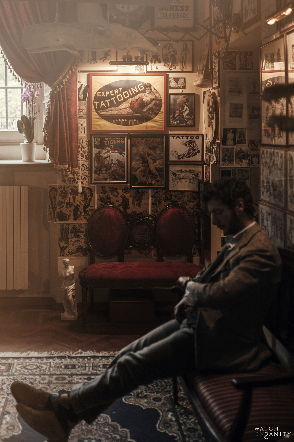 Mattia Trivella sembra incarnare alla perfezione lo stile e il piglio del modello day-date: un tatuatore amante del vintage, delle linee pulite, delle forme essenziali e dell’eleganza. Si capisce al volo, anche solo osservando il suo abbigliamento: un tatuatore in gilet e camicia, che ama circondarsi di oggetti belli, da collezione, a volte introvabili, e che ama tatuare i suoi clienti rispettandone i gusti, senza mai tradire il suo rispetto per la tradizione fortemente legata allo stile che propone.