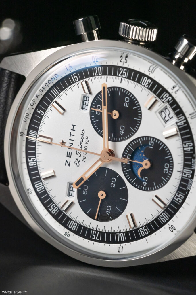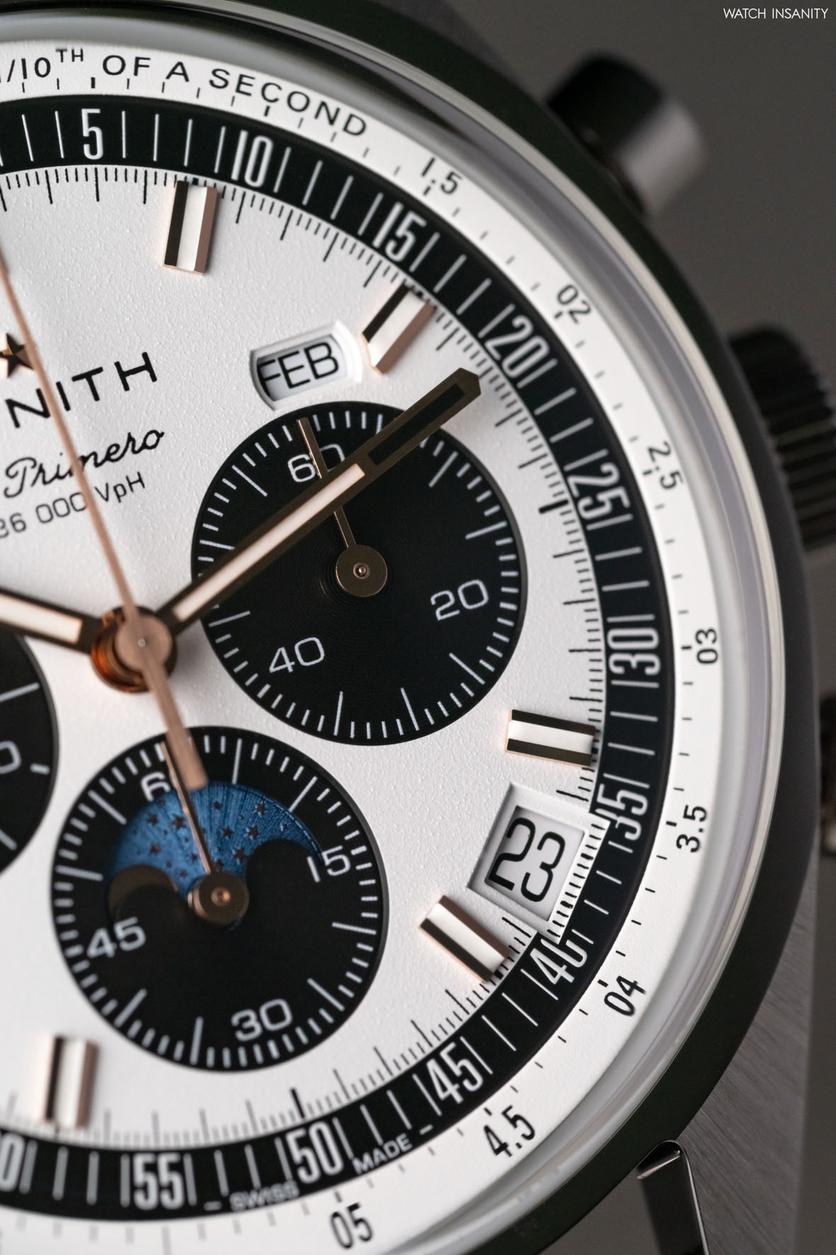 Il pezzo forte dell’orologio, naturalmente, è il triplo calendario. La visualizzazione scelta da Zenith è piuttosto classica. A ore 4:30 si trova la finestra del datario, nella posizione tanto consueta quanto controversa del Chronomaster Original. Per il giorno della settimana e il mese è stata utilizzata la disposizione che si trova in tanti tripli calendari della metà del secolo scorso: due finestrelle poste al di sopra dei contatori cronografici, rispettivamente a ore 10 e a ore 2. Nell’idearle, i design di Zenith non si sono però abbandonati alla banalità.