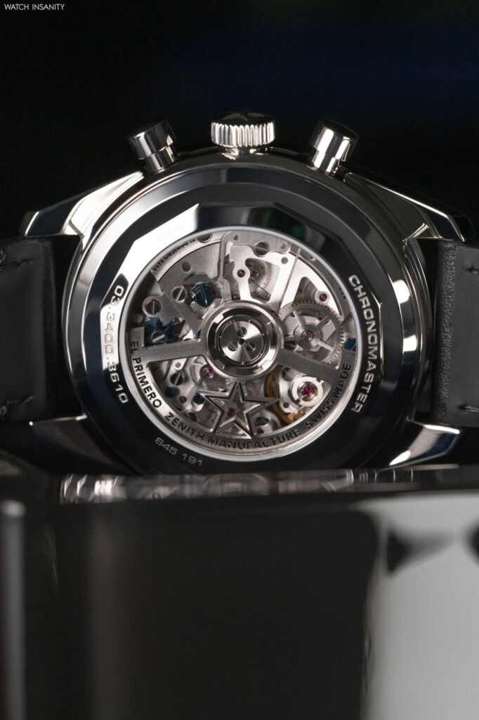 Come è noto, l’El Primero 3610 lavora da alta frequenza (5 Hz o 36.000 alternanze/ora) e, a fronte di queste prestazioni, le 60 ore di riserva di carica costituiscono un’ottima performance. La gestione delle indicazioni del triplo calendario e del cronografo da parte di questo calibro a carica automatica è stata resa visibile attraverso il fondello in vetro zaffiro.