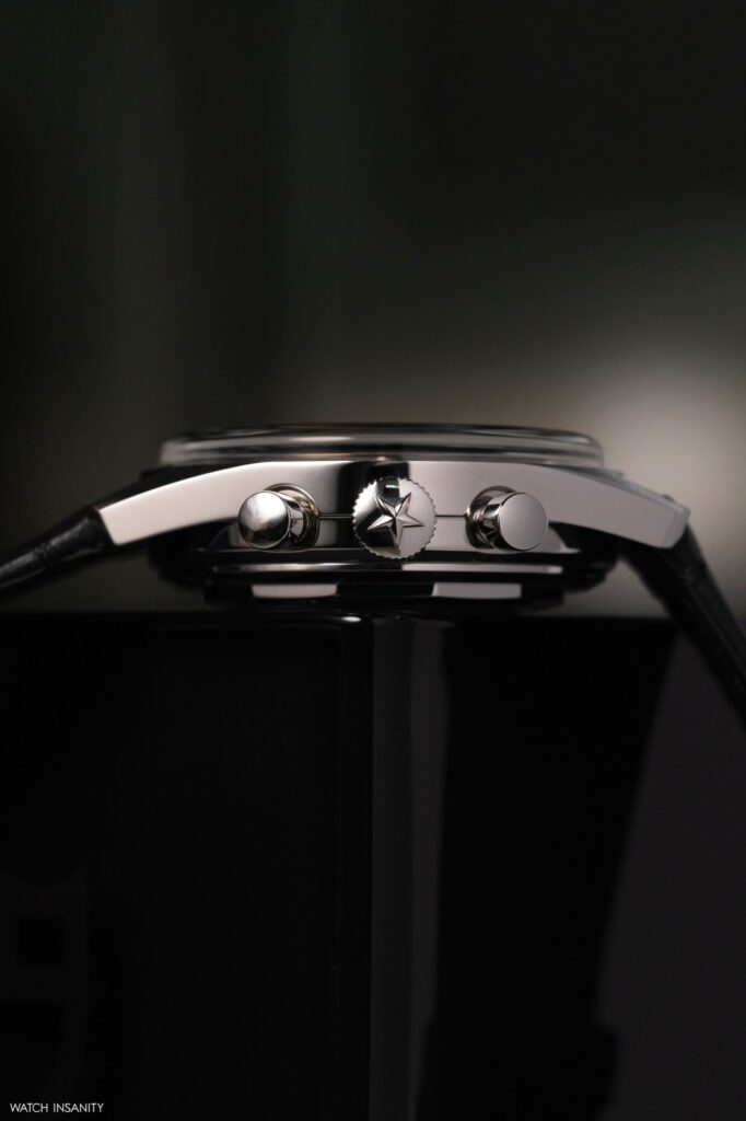 Detto della cassa, l’altro grande lavoro fatto dal brand sul Chronomaster Original Triple Calendar ha interessato il quadrante, che mantiene la classica impostazione a tre contatori e molti degli elementi visivi che caratterizzavano l’A386. Per i contatori, appunto, non si è scelta la configurazione con i dischi parzialmente sovrapposti né di diversi colori, ma quella con i dischi separati e posti su un livello inferiore rispetto a quello del quadrante. Il protagonista del nostro shooting esclusivo li ha neri, con una finitura concentrica, nella classica configurazione panda a contrasto con il quadrante opalino.