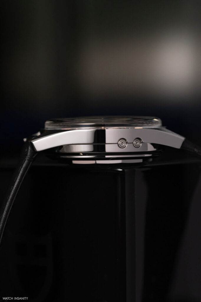 Invece di creare delle semplici finestre rettangolari ritagliate, in entrambi gli elementi esse sono scalinate e caratterizzate da una sottile curvatura ovale lungo i lati più corti. Una curvatura delicata, quasi impercettibile, che consente loro di armonizzarsi con l’architettura complessiva del quadrante, che è prevalentemente curvilinea. Le indicazioni del triplo calendario possono essere regolate utilizzando due pulsanti correttori posti nella carrure a ore 9. Nonostante siano ben incassati, la loro presenza interrompe un po’ la bella linea lucida del lato cassa.