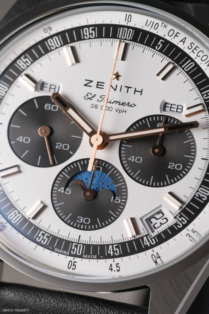 A ore 6, inserite all’interno del contatore dei minuti cronografici, si trovano le fasi lunari, la cui visualizzazione è quella con la finestra a due lobi. Due sono gli elementi da mettere in luce in questa complicazione. Uno è il cielo: il suo colore blu indaco, non uniforme ma lavorato con effetto soleil, è l’unico tocco di colore differente dal bianco, dal nero e dall’oro che troviamo sul quadrante. Un oro che torna sulla luna e sulle stelle. Le stelle sono l’altro elemento da osservare: piccole sì, ma lavorate con la forma a cinque punte che rimanda al logo di Zenith. Quando sono i dettagli a fare la differenza…