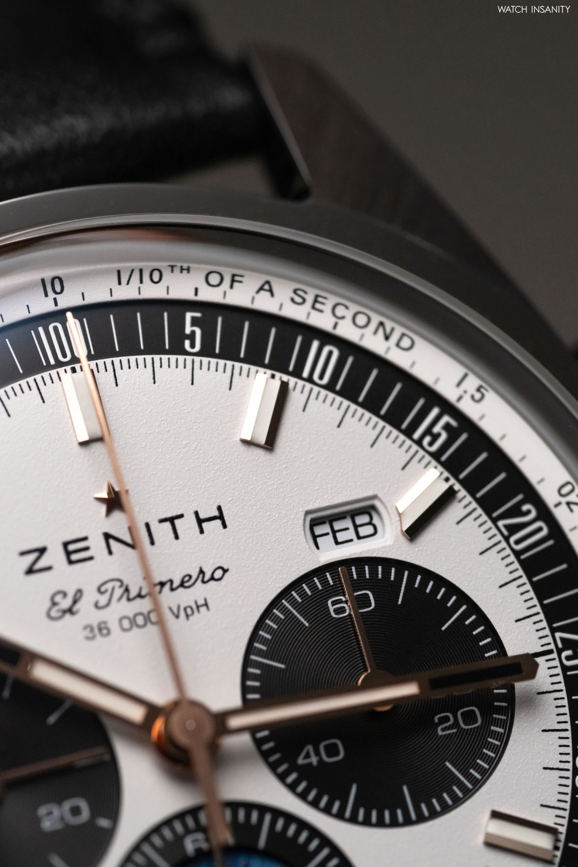 Alla periferia del quadrante ci sono le scale del decimo di secondo (non dimentichiamo che nella cassa batte il calibro El Primero da 36.000 alternanze/ora) e al loro interno si trovano gli indici, applicati, sfaccettati e riempiti di SuperLuminova. Ciò che ne aumenta l’impatto estetico è la placcatura in oro, visibile sui loro lati inclinati, che richiama la medesima finitura presente su tutte le lancette, sia su quelle centrali sia su quelle dei contatori cronografici. L’effetto di omogeneità stilistica è ben evidente.
