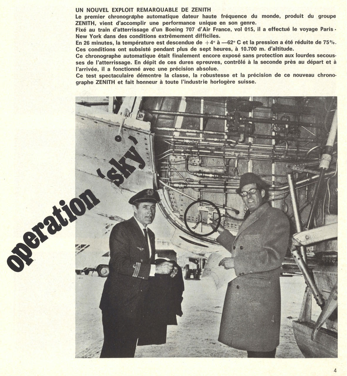 Nel 1970, il modello A385 suscitò l’attenzione internazionale quando partecipò all’“Operation Sky” di Zenith. Questo test estremo consisteva nel fissare l’orologio all’apparecchiatura di atterraggio di un Boeing 707 dell’Air France durante un volo da Parigi a New York per testarne la resistenza alle aggressioni esterne, come le variazioni drastiche di temperatura, la forza dei venti e le variazioni della pressione atmosferica. All’atterraggio, l’orologio funzionava ancora perfettamente. Questa impresa ardita testimonia la fiducia e la sicurezza di tutti coloro che avevano lavorato instancabilmente alla realizzazione del calibro El Primero, e ha anche dimostrato concretamente che un movimento meccanico era superiore ai movimenti al quarzo, che iniziavano a diffondersi all’epoca e che non avrebbero potuto sopportare le variazioni termiche sperimentate dall’orologio durante il volo.