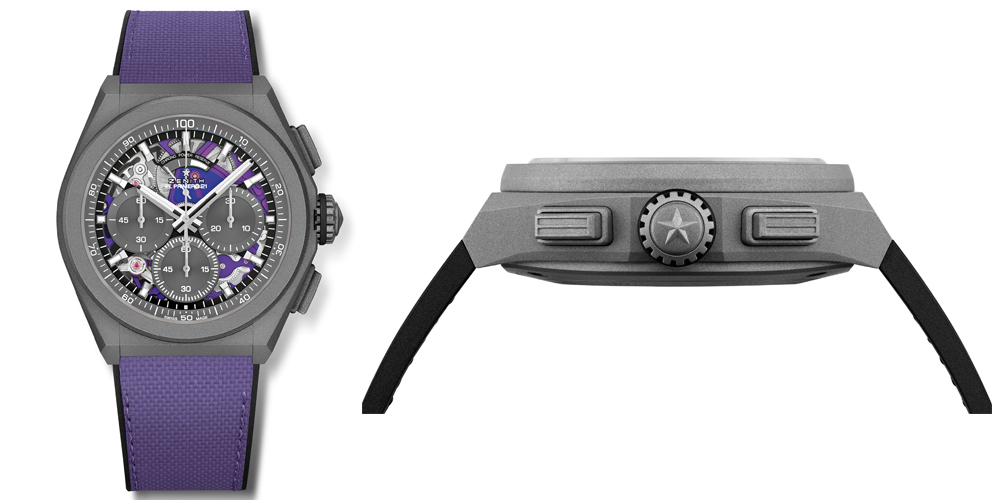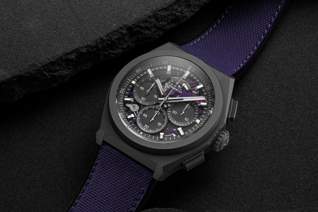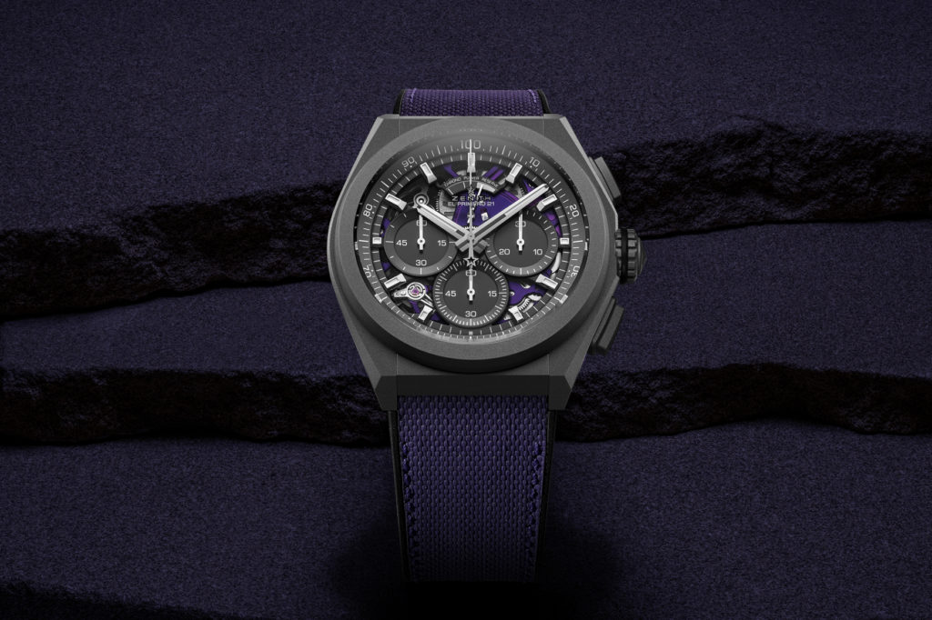 La cassa sfaccettata di 44 mm del DEFY valorizza i ponti viola del movimento creando un contrasto sorprendente, e presenta una finitura opaca interamente sabbiata, che enfatizza le sfumature metallizzate più scure del titanio. Le tonalità del movimento aperto, che variano dal viola più luminoso ad un color porpora, sono completate dal cinturino in caucciù nero con inserto viola, che riproduce l’effetto di un tessuto intrecciato. (Prezzo CHF 13.400)